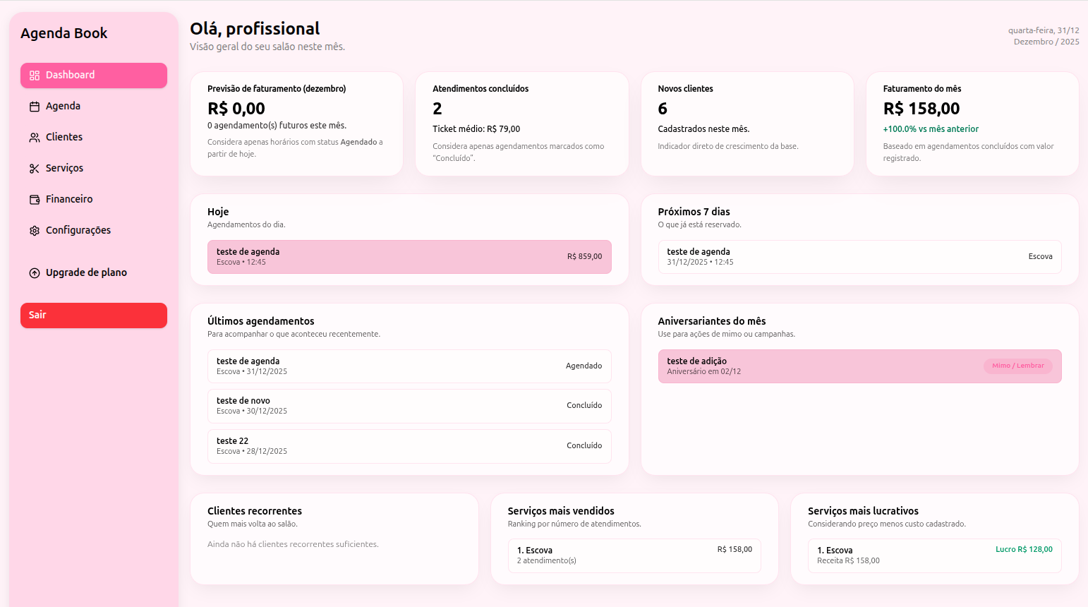 O Agenda Book é um sistema de agenda online feito para profissionais autônomos organizarem clientes, horários e financeiro em um só lugar. Funciona direto no navegador, sem instalar nada.
